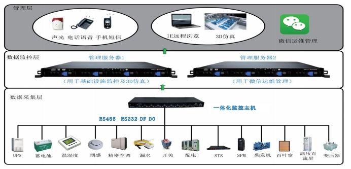 動力環(huán)境監(jiān)控系統(tǒng)主要針對各種通信用機房的設(shè)備特點和工作環(huán)境,對機房內(nèi)的電源、蓄電池組、UPS、發(fā)電機、空調(diào)等智能、非智能設(shè)備以及溫濕度、煙霧、漏水、門禁等環(huán)境量實現(xiàn)“遙測、遙信、遙控、遙調(diào)”等功能。 動力環(huán)境監(jiān)控系統(tǒng)充分利用了機房內(nèi)傳輸設(shè)備所能提供的各種傳輸信道資源,實現(xiàn)機房內(nèi)各項告警和數(shù)據(jù)快速有效的上傳,同時由監(jiān)控中心軟件進行圖形化人機界面展示,可對所有機房的全參數(shù)、全方位的監(jiān)控,智能化短信外呼報警,實時事件記錄,提高用戶的維護管理效率,實現(xiàn)機房可靠的科學管理。